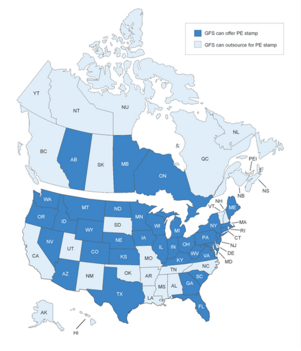 At GFS, for example, we recognize how crucial it is for us to have as part of our team an experienced, talented and licensed engineering staff. Five of our engineers have pursued PE licensure, giving the ability to provide licensure in a total of 32 U.S. states and three Canadian provinces. In the remaining states and provinces, GFS can easily outsource to an established engineer for a PE stamp. Our PEs may apply for stamps in those areas or contract out for this service. In the event that outsourcing for a PE stamp is necessary, additional time is usually required to obtain these stamps.