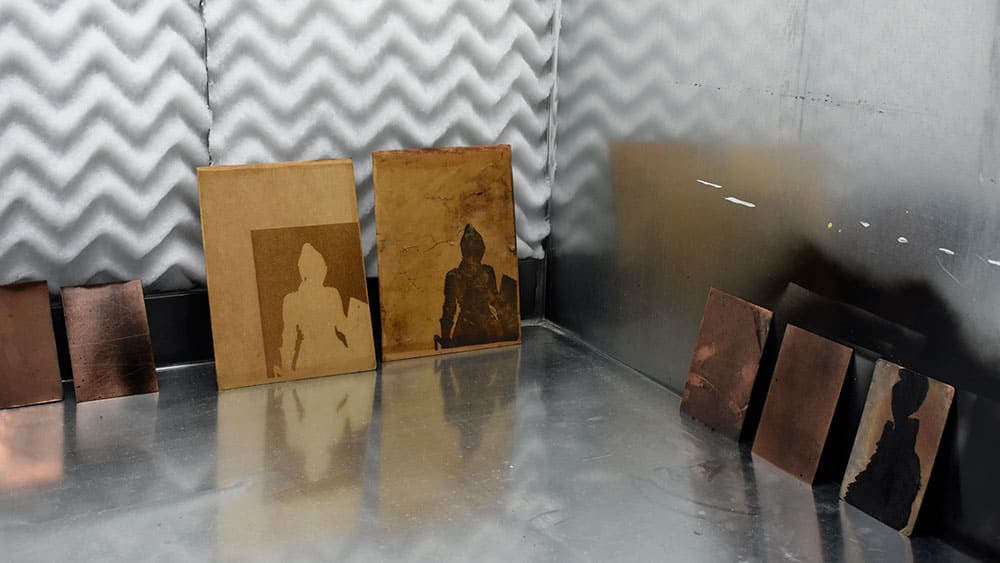 Each semester, his class of 14 to 18 students uses the paint booth to spray paints and solvents, mainly with garden-variety spray paint and occasionally an acrylic paint that resembles a floor wax. They spray plates that they then etch, as the paint gives the plates a speckled effect. They also use lithography — a printing process using a metal plate on which the image areas are worked with a greasy substance so the ink adheres to them, while the non-image areas are made ink-repellent.