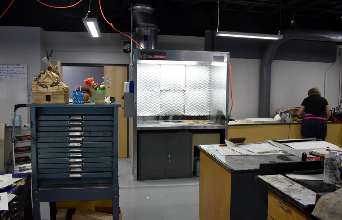 The printmaking lab is now twice as large and features a 5-by-4-foot Bench Paint Booth from Global Finishing Solutions (GFS). It features an integrated, raised booth bench, adequate airflow and high-efficiency filtration. Lutsky takes comfort in knowing his students are now working in a code-compliant environment.