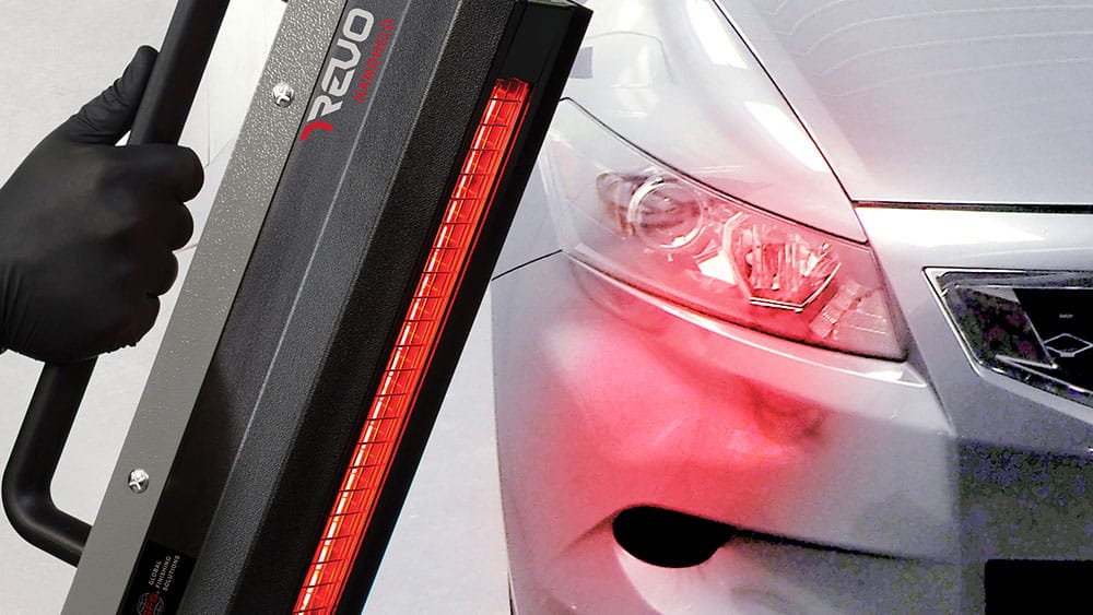 First, when cleaning the repair area, use the Handheld to remove decals or emblems. Then, if you need to apply filler during body repair, it dries in only a couple of minutes. Immediately after, you can use a high-quality, 2k primer (cured in five to 10 minutes) and will be ready to sand. The repair area is then immediately ready for a base coat and clear coat, which can also be cured in a few minutes. Cut hours of spot repairs to a half hour or less with the REVO Handheld.