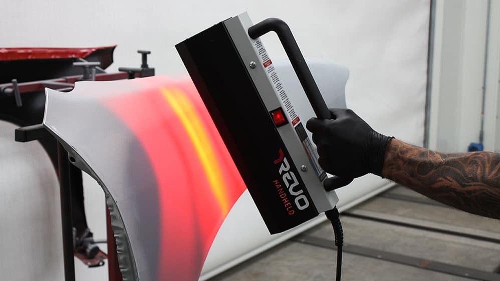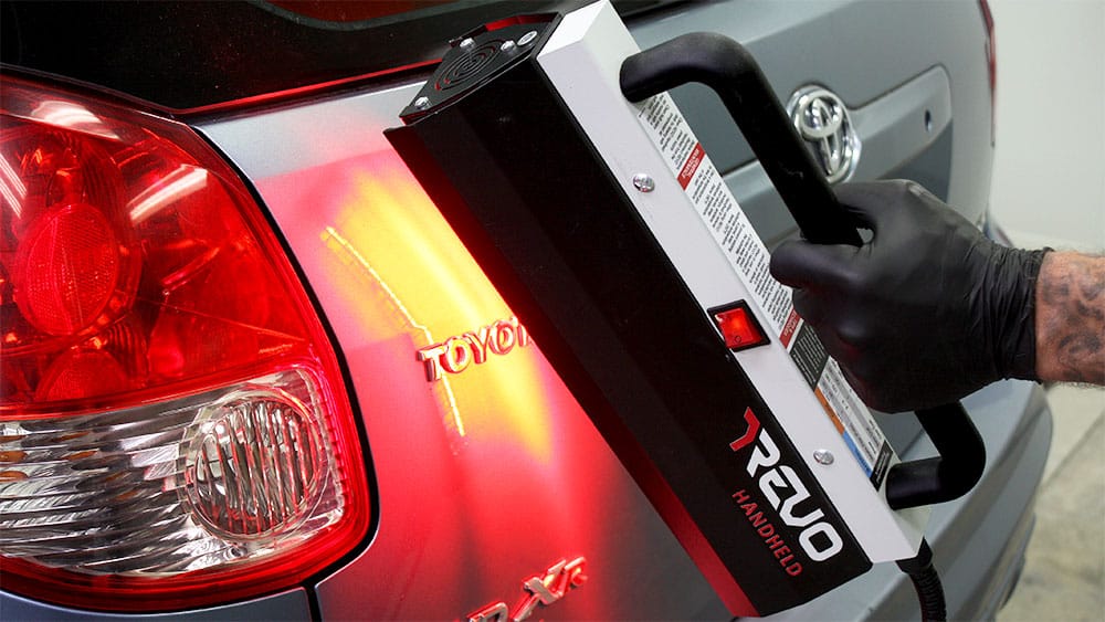 Arguably the best use for the REVO Handheld, you no longer have to use a heat gun to warm up a bumper. With the Handheld, you can get a bumper to 200 degrees Fahrenheit in 10 to 20 seconds. And because the heating area is so large, it also relieves the stress around the dent, which can be time-consuming using a heat gun or any other method. After the dent is pulled out, the Handheld can then be used throughout the entire paint repair process.