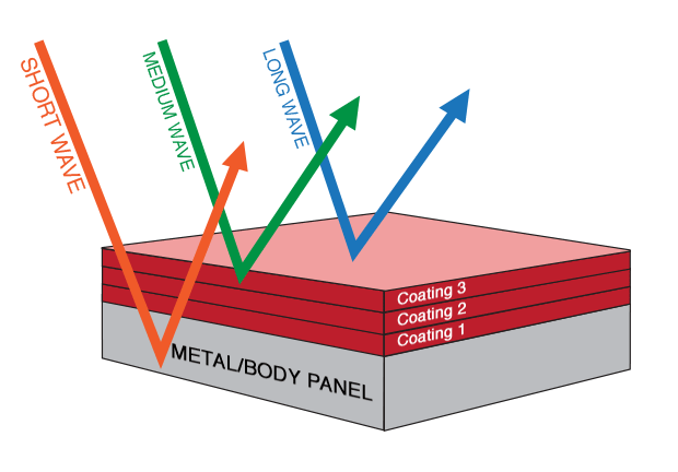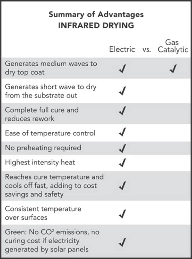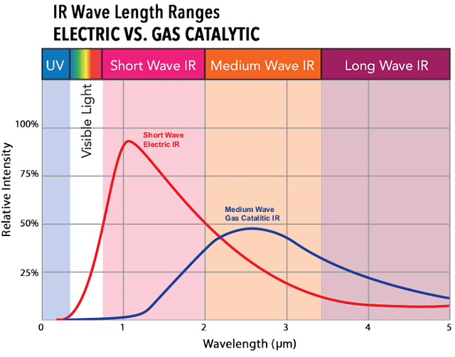 Short wave electric IR brings multiple layers of paint to curing temperature within seconds. The panel is completely cured in less time than it takes to preheat gas catalytic units. Not having to cure each layer individually ā and preheat the gas system each time ā leads to significant throughput gains for shops using short wave electric infrared curing technology.