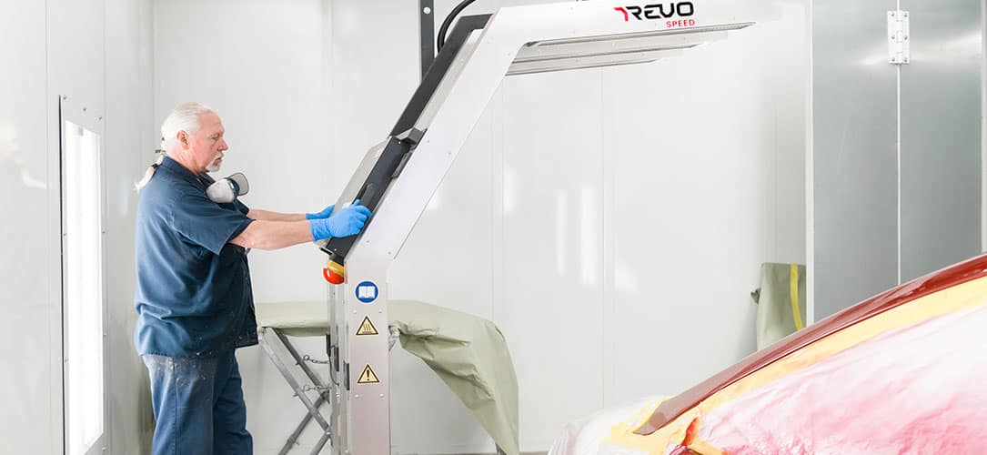 Penetrating directly to the surface of the substrate — whether metal, plastic or another material — short wave electric infrared curing technology heats the coating and rapidly cures it from the inside out. REVO Systems concentrate heat only on panels in need of curing, rather than the entire vehicle.