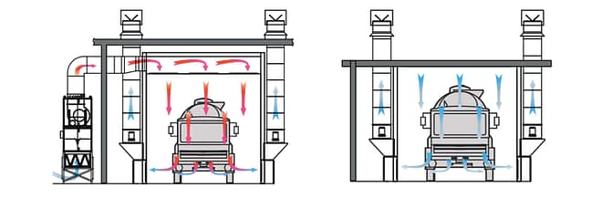 In downdraft paint booths, air enters through a filtered ceiling plenum in a downward motion, flows vertically over and around the product, and exits through a filtered exhaust pit in the floor that runs nearly the entire length of the paint booth. Unlike side downdraft booths, the airflow does not have to fight gravity or pass by the painter; rather, it is assisted by gravity, which carries overspray into the exhaust pit.
