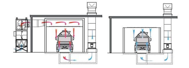 A larger footprint is unavoidable with side downdraft paint booths, as they require more exhaust fans, ducting and roof penetration, and the exhaust plenums on the sides increase the overall width of the spray booth. Operational costs of side downdraft paint booths are slightly higher than cross draft paint booths due to the full-ceiling filtration. Also, as air gets pulled into the exhaust chambers on the sides of the booth, overspray can hit the painter.