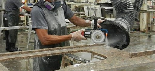 Some stone fabricators require employees to wear a respirator when cutting engineered stone, but others provide only a face mask as PPE. Either way, inhaling at least small amounts of silica is often unavoidable, as the dust lingers in the air and eventually settles on equipment and the floor, and on workers themselves.