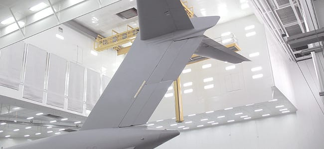 Lights in paint hangars are typically expensive, high-wattage HID lamps that drop from the ceiling and are spread far apart to reduce costs. Low lighting means less visibility, making it difficult for painters when spraying certain parts of an airplane.