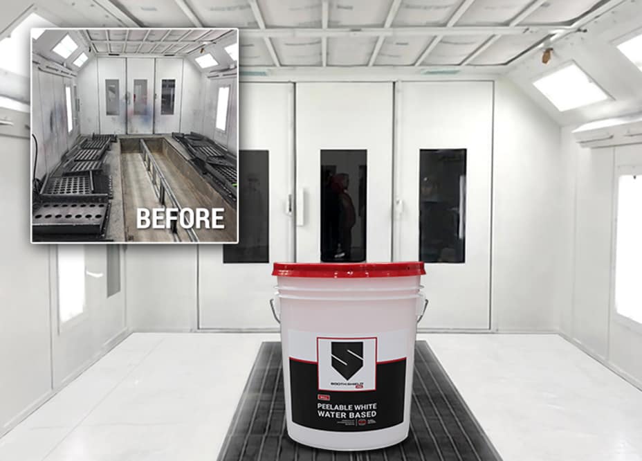 Booth Shield Pro delivers all the benefits of our original Booth Shield product — including improved brightness and visibility — with a simpler application process and better overall performance. With Booth Shield Pro, a paint booth’s surfaces will showcase a smooth texture and clean white finish, benefiting from the redesigned formula’s enhanced durability and improved elasticity and peelability.