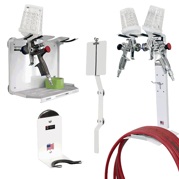 The Hose & GunHanger is a magnetic air hose hanger and double spray gun holder, designed for paint booths, prep areas or paint mix rooms. It comes equipped with a hook — for storing tape, gloves, tack cloth or other commonly used supplies. With the Hose & GunHanger, you can spend more time working and less time worrying about clutter slowing down your operation.